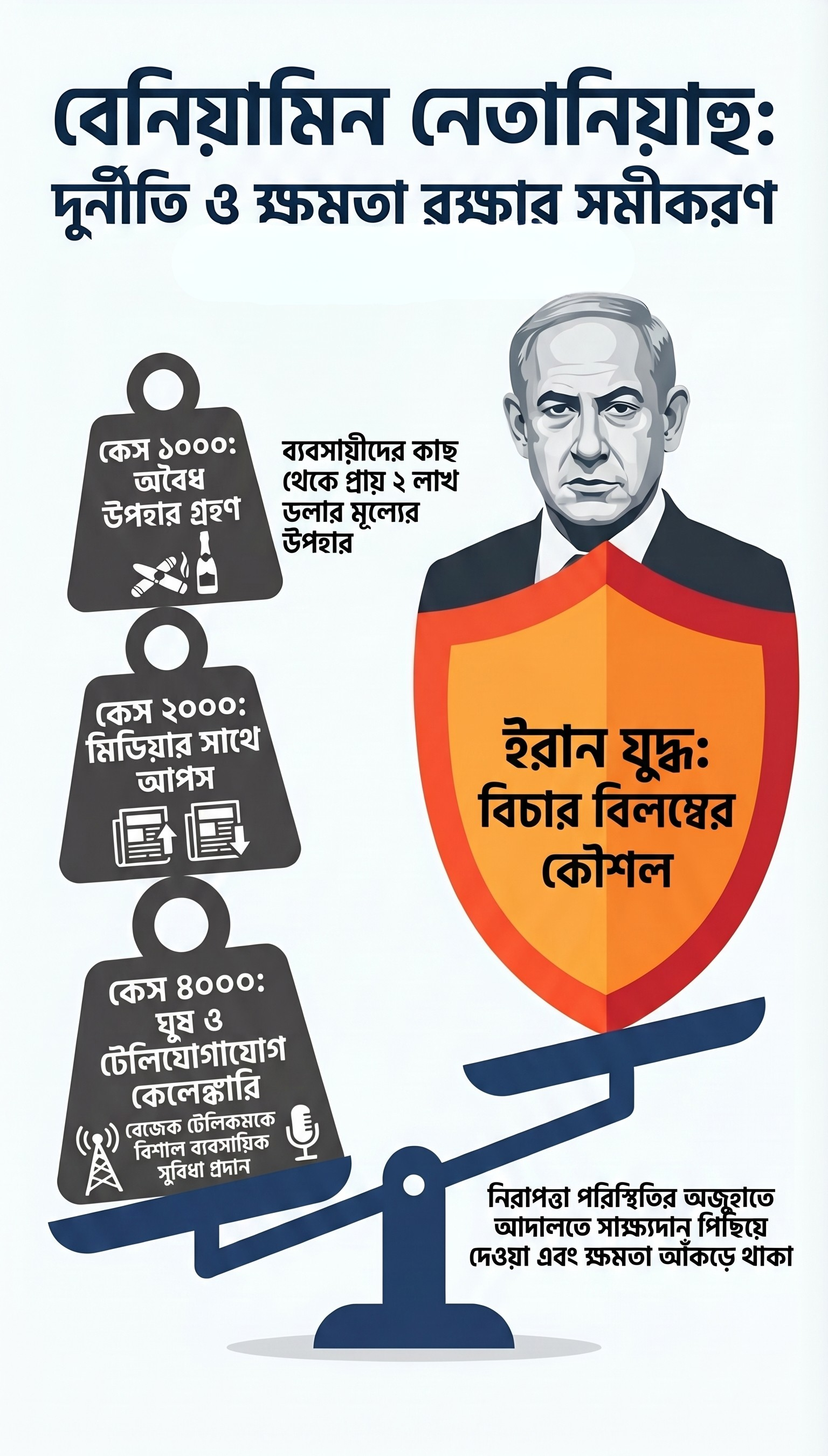 ফলে প্রশ্ন উঠছে—নেতানিয়াহুর বর্তমান যুদ্ধনীতি কি মূলত নিজের ক্ষমতা ধরে রাখা, দুর্নীতির বিচার এড়ানো এবং রাজনৈতিক বৈধতা বজায় রাখার একটি পরিকল্পিত কৌশল কিনা।
