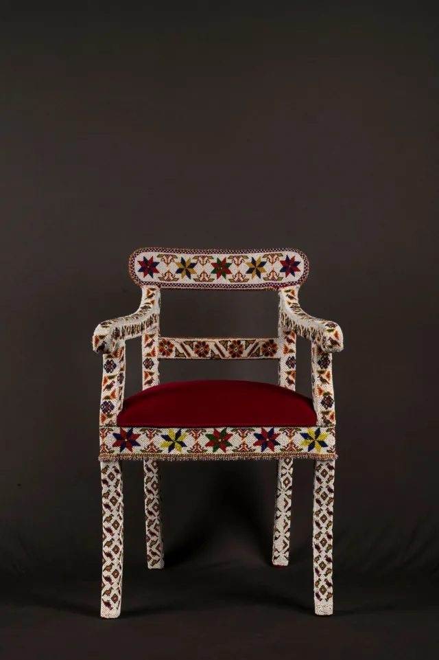 রঙিন সিরামিক পুঁতির সূক্ষ্ম নকশায় ঢাকা এই চেয়ার সংস্কার করতে আট মাস সময় লেগেছে। ধারণা করা হয়, এটি কোনো স্থানীয় প্রধানের ছিল।