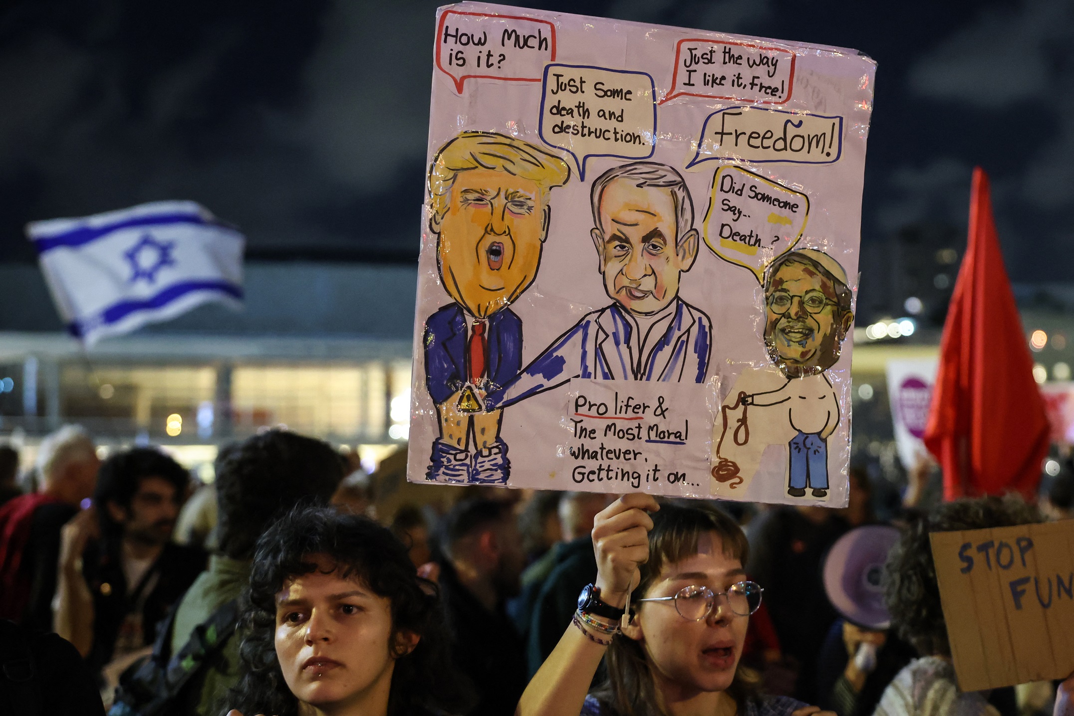 ইরানের সঙ্গে চলমান যুদ্ধ ও সরকারের নীতির বিরুদ্ধে বিক্ষোভে তেল আবিবের হাবিমা স্কয়ারে প্ল্যাকার্ড হাতে অংশ নেন ইসরায়েলের বামপন্থীরা। ছবি: এএফপি
