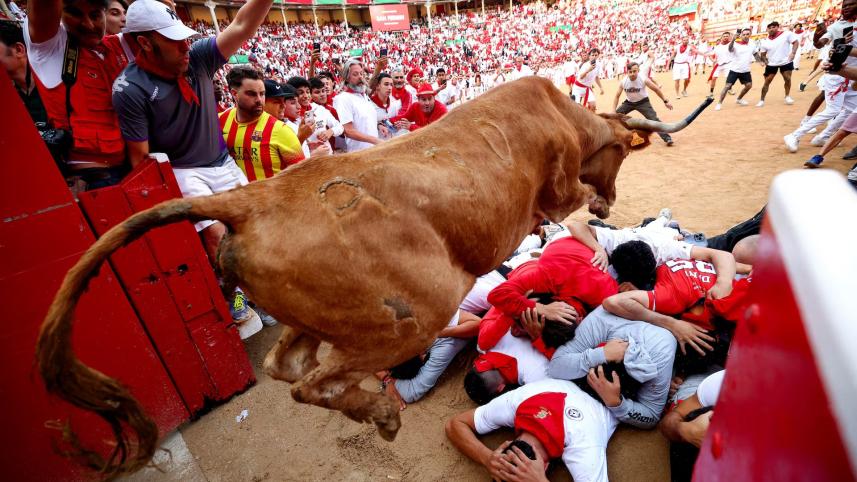 ১৪ জুলাই, স্পেনের পামপ্লোনায় সান ফেরমিন উৎসবের সময় বুলরিংয়ে উৎসবকারীদের ওপর দিয়ে লাফিয়ে যাচ্ছে একটি বুনো গরু। ছবি: রয়টার্স/আলবার্ট গিয়া