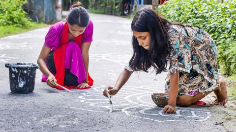 দুর্গাপূজা উপলক্ষে বাড়ির সামনে রঙ দিয়ে আল্পনা আঁকছে দুই শিশু। প্রান্তি রায় ও আল্পনা মল্লিকের তুলিতে উৎসবকে করেছে আরও প্রাণবন্ত। খুলনা কসরাপাড়া গ্রাম থেকে ছবি তুলেছেন দ্য ডেইলি স্টারের আলোকচিত্রী হাবিবুর রহমান।