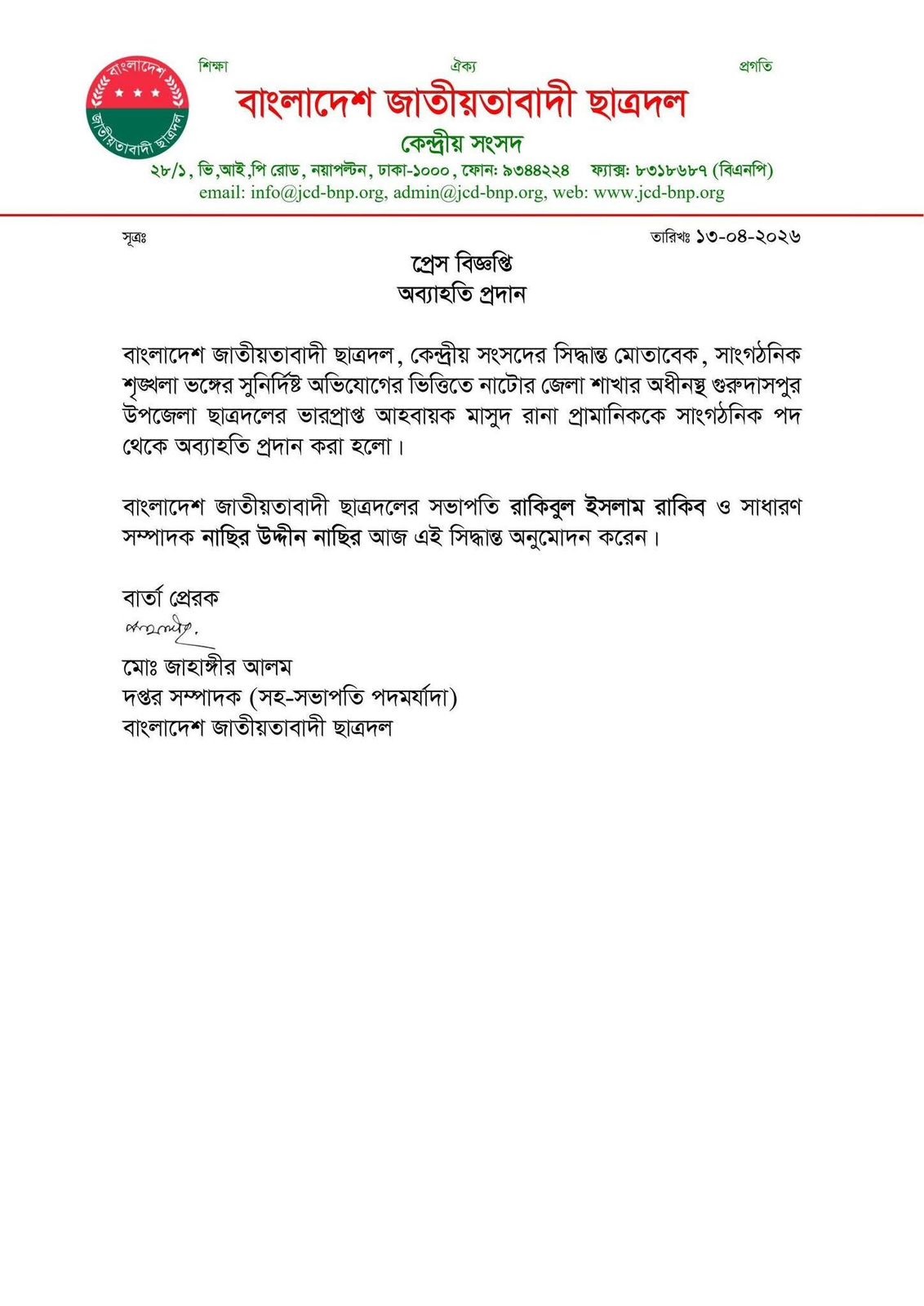 আজ সকালে জাতীয়তাবাদী ছাত্রদলের কেন্দ্রীয় কমিটি এক সংবাদ বিজ্ঞপ্তির মাধ্যমে তাকে পদ থেকে অব্যাহতি দেয়।