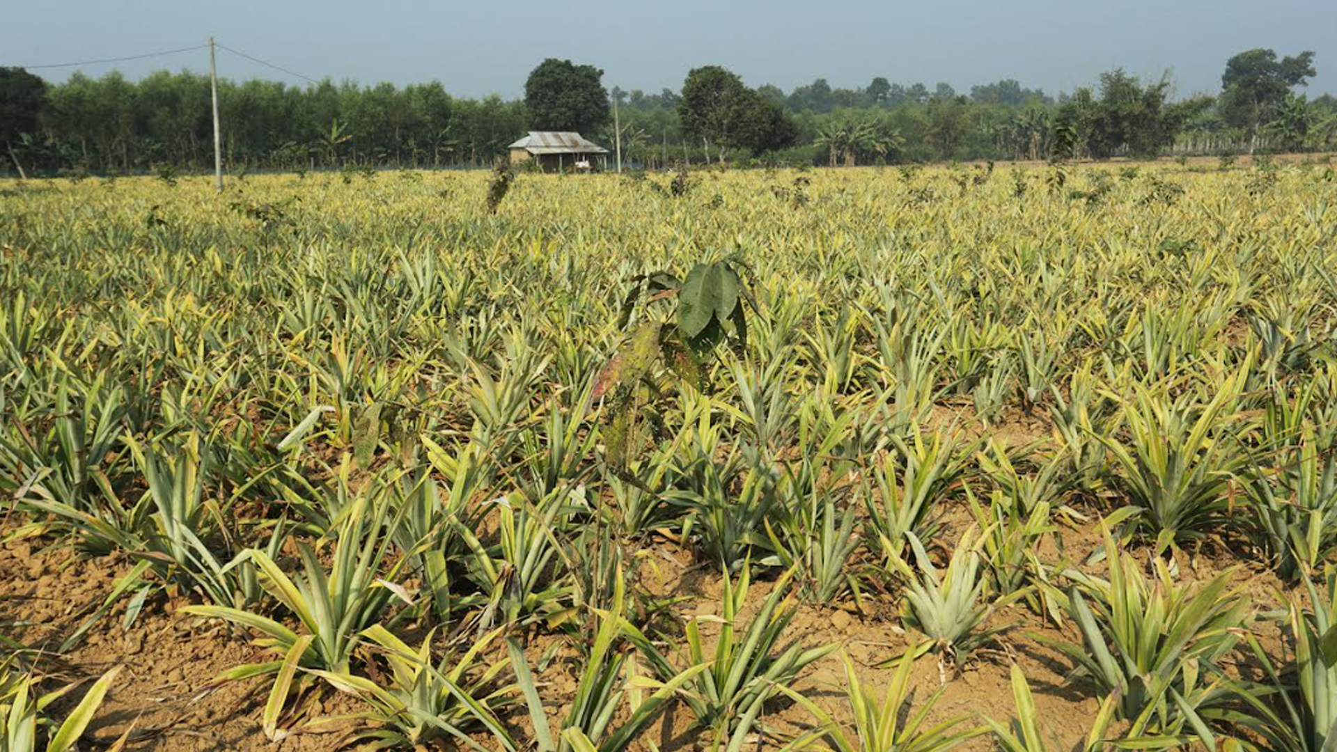 মো. মুনাফ মুন্না যৌথভাবে ২ দশমিক ৪ একর জমির মালিক। এই জমিতে তিনি কয়েক দশক ধরে বসবাস করছেন। ১৬ ডিসেম্বর তার প্লটে গিয়ে আনারসের চারার স্তূপ দেখতে পাই। চলতি বছরের ১৬ জানুয়ারি আবার যখন সেখানে যাই, তখন পুরো এলাকাজুড়ে আনারসের গাছ লাগানো হয়ে গেছে।